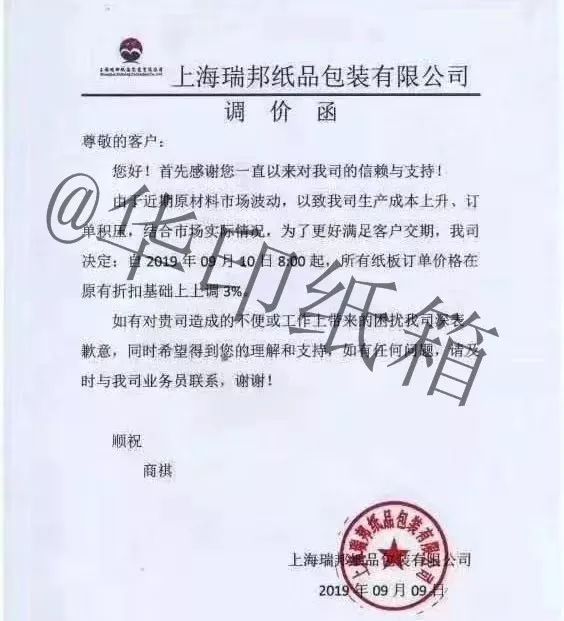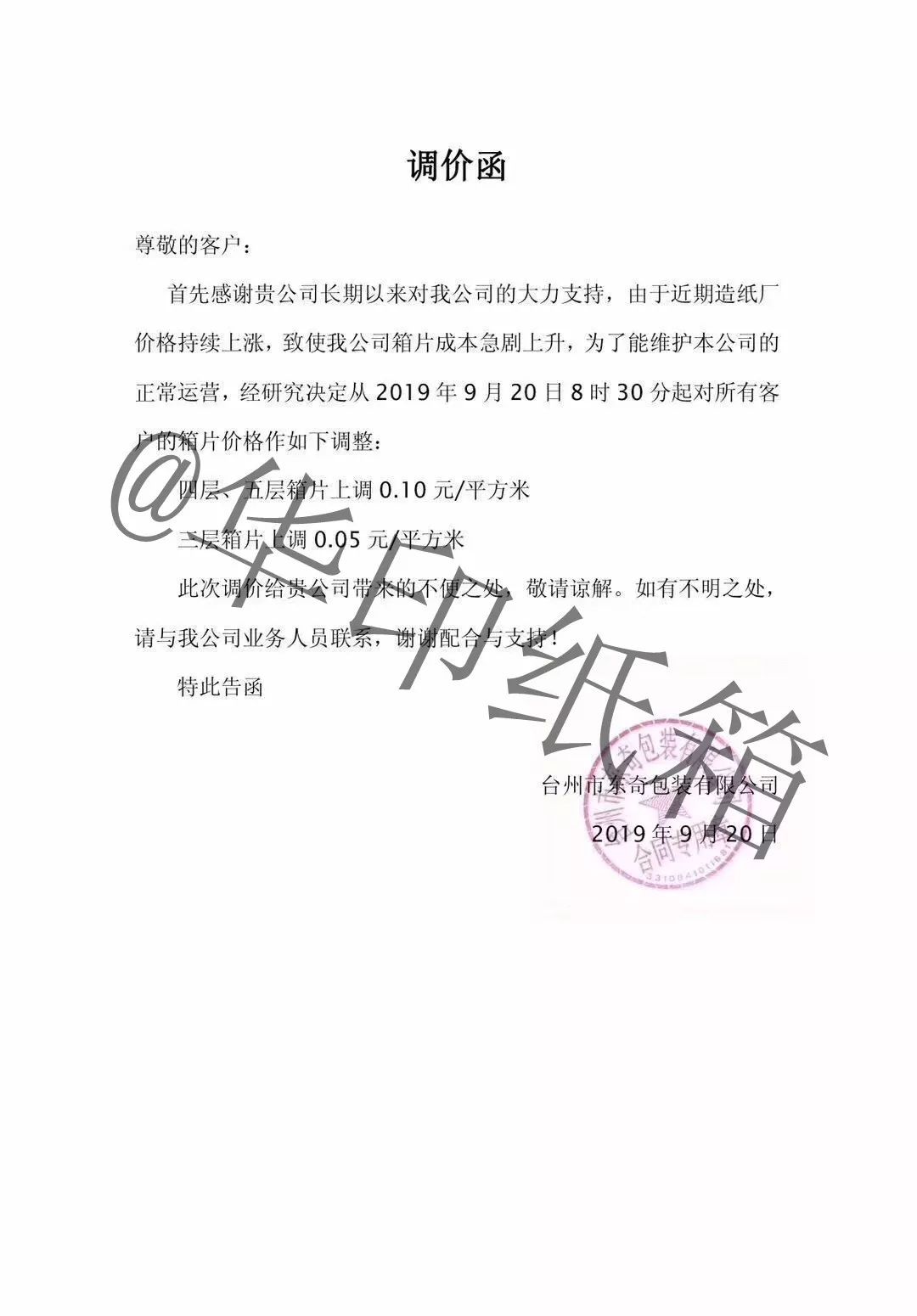 湖北福祥包装材料股份有限公司:自2019年9月4日18:30起,取消纸板大平方价格实惠政策,所有纸板价格在现有报价单折扣基础上上调3%。近期原纸价格极不稳定,若遇纸板价格再次上调,自上涨之时起所有未生产订单一律同步上调价格。